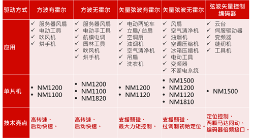 目前已量产系列为:内建最高可支持高压600伏特驱动器的NM1800 系列;内嵌CAN 2.0B、两组ADC、两组OPAmp与矢量控制单元的高性能NM1500 系列;支持单电阻电流采样的多功能型NM1200系列;和低管脚NM1100系列;NuMicro®马达专用单片机适用于电动车、工业控制、风机驱动、电动工具、工业自动化、电子调速器、能源电力、马达控制等应用领域。