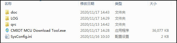 工具目录分为五个部分,其中CMIOT MCU Download Tool为应用程序,SysConfig.ini文件为密钥文件,doc文件夹保存说明文档,LOG文件夹保存log文档,qrc文件夹保存所需图标。