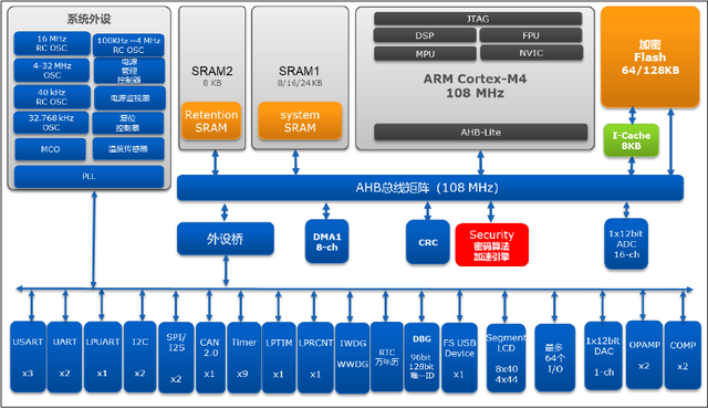 相比竞品资源更为丰富,12×Timer、6×Uart,1×12bit DAC、 1× 低功耗计数器 (LPRCNT)、24 通道触摸传感控制器 (TSC)、8COM 段式液晶显示驱动器(8*40SegLCD)。
