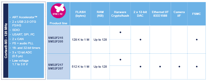 • STM32F205/215 – 120 MHz CPU/150 DMIPS,高达1MB、具有先进连接功能和加密功能的Flash存储器