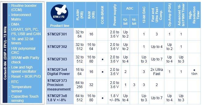 • STM32F301、STM32F302、STM32F303通用产品线范围从基本的、节省成本的外设集,直到具有更高的性能和模拟功能,可管理高达三个FOC电机控制