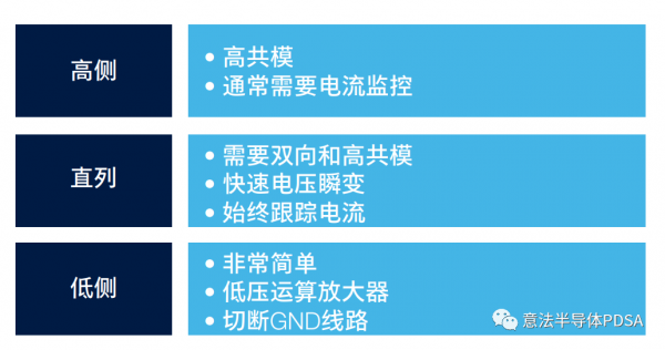 分流电阻可以置于几个不同的位置,以测量流经应用的电流。每一种都有特定的优点和缺点。