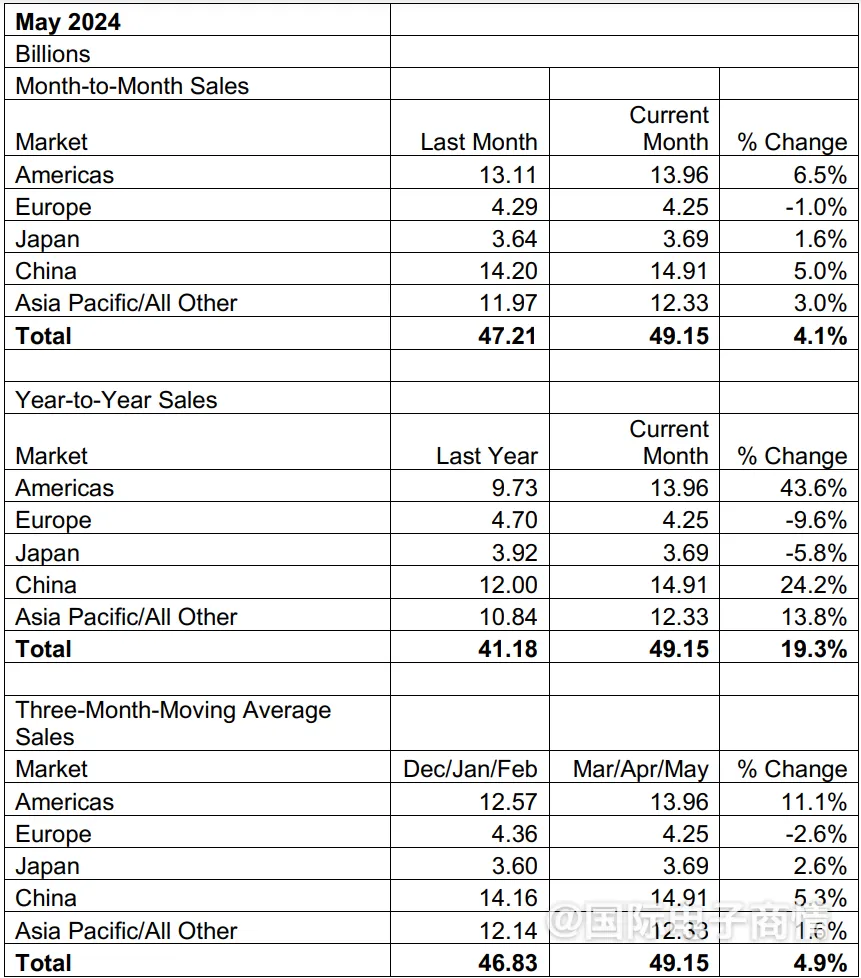 按地区划分,美洲市场5月半导体销售额表现最突出,较去年同期成长高达43.6%;中国、亚太/所有其他地区也分别较去年同期增加24.2%、13.8%;日本和欧洲则分别减少5.8%、9.6%。