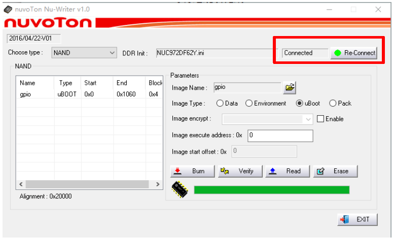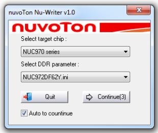 开启NuWriter,选择正确的芯片型号,按下“Continue”