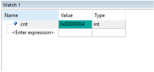 点击“View->Watch & Call stack Window”出现相应窗口选择Watch 1-3 中的任一个窗口,按动F2, 在Name 栏填入用户变量名如 cnt 等,但必须是存在的变量。如果想修改数值可单击Value 栏出现文本框后输入相应数值。用户可以连续修改多个不同的变量。