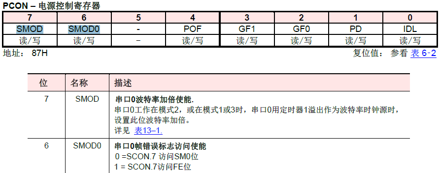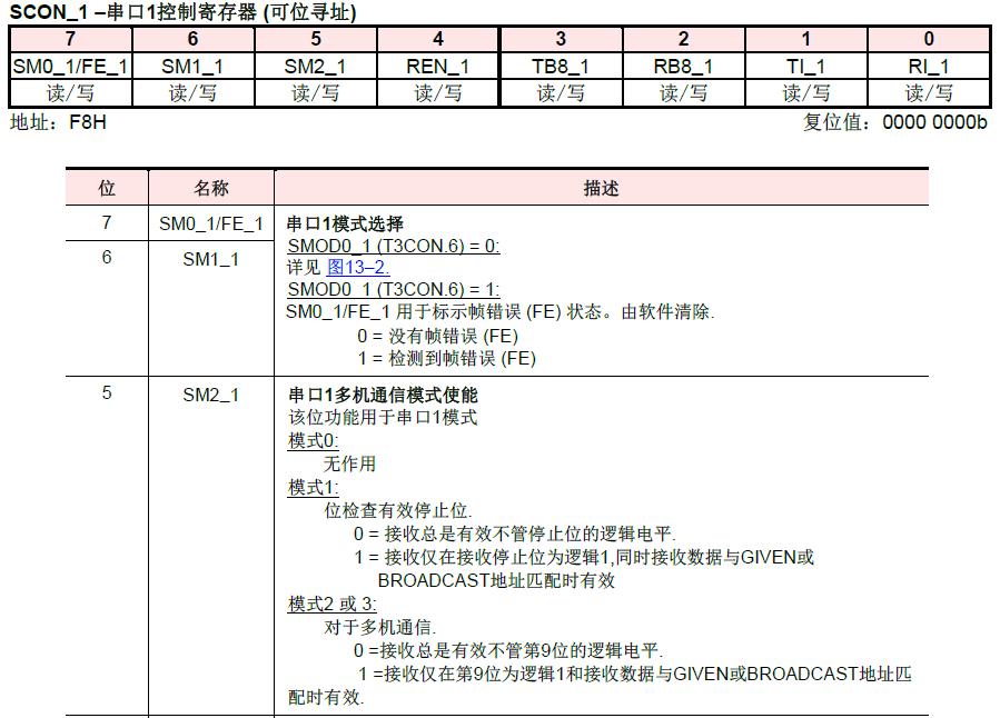 当帧错误发生时,FE标志由硬件置位。如果必要,FE可在串口中断程序中检测。注意在对FE标志位进行读写时,同时SMOD0必须为1。如果FE被置位,那么下次即使接收到的正确数据帧也不会将其清除。对该位的清除必须由软件来完成。