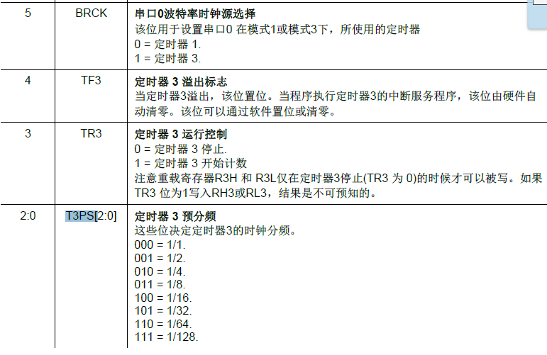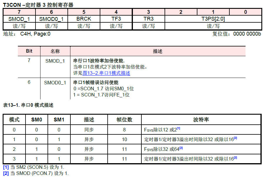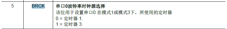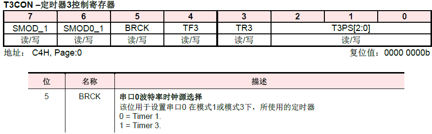 在模式1或模式3,串口0的波特率时钟源可通过BRCK (T3CON.5)选择定时器1或定时器3。对于串口1,只有采用定时器3作为唯一的时钟源。