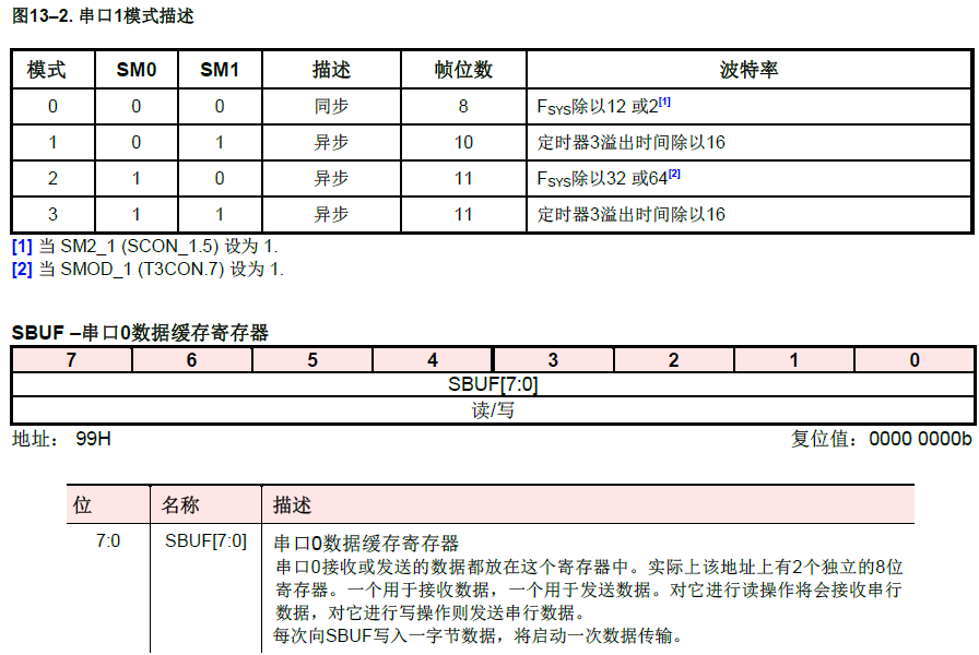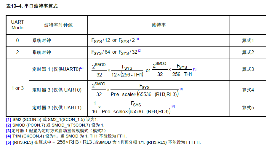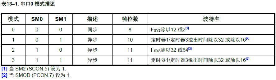 串口的不同模式的波特率时钟源和速度是完全不同的。详见表 13–3. 用于设定不同的波特率。