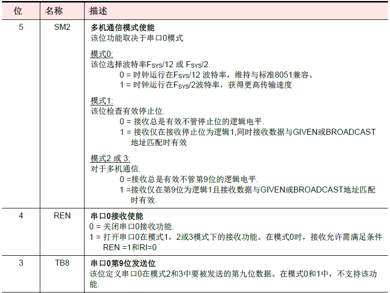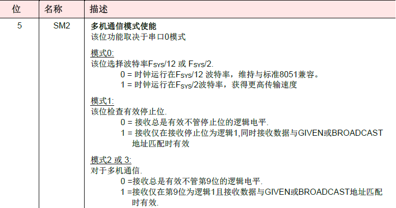 SM2 在模式 0 下无效。若 SM2 置 1,模式1可用于检测有效的停止位。同时将不会产生中断除非有效停止位已经接收。
