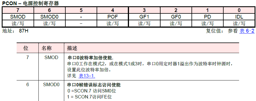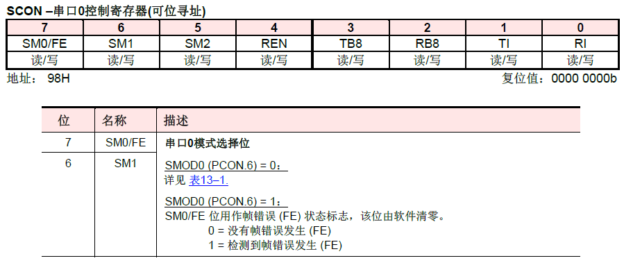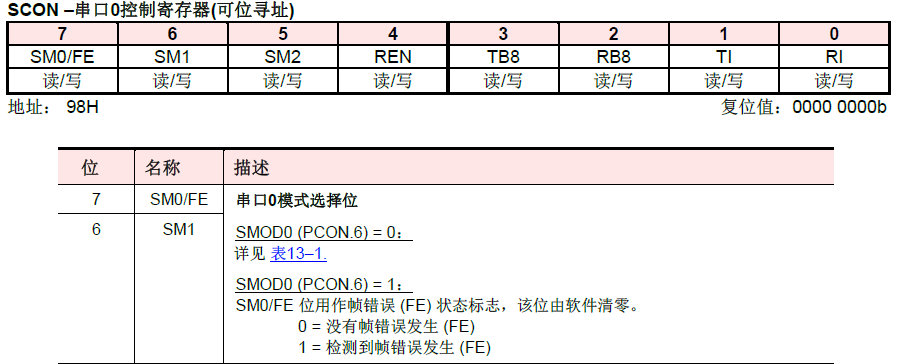 FE为帧错误标志,位于SCON第7位,这个位正常被用作为SM0 。当SMOD0 (PCON.6)置1时,帧错误检测功能打开,它作为FE标志。SM0和FE其实是相互独立的标志位。