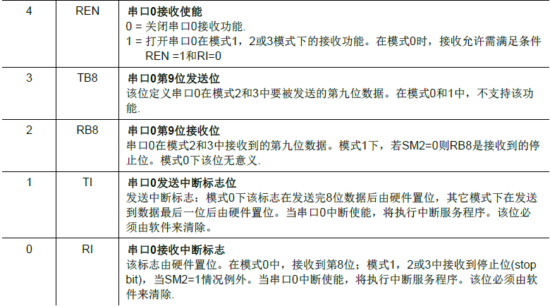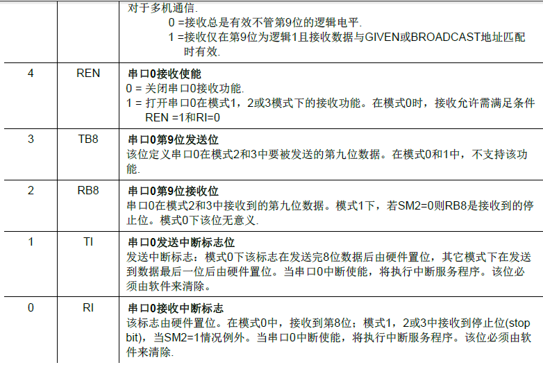 SCON = 0x52; //01010010 SM0=0,SM1=1即为模式一,REN=1,打开串口0在模式1,2或3模式下的接收功能。TI=1串口发送中断标志位,在发送到数据最后一位后由硬件置位。当串口0中断使能,将执行中断服务程序。该位必须由软件来清除。