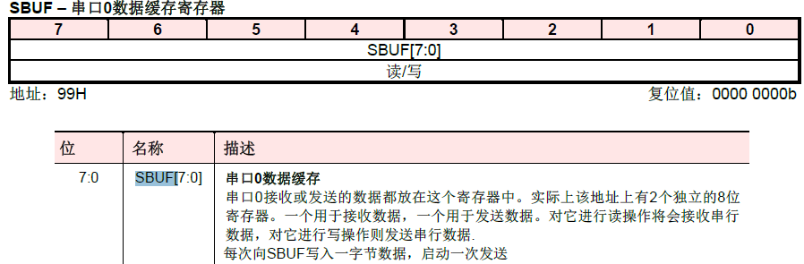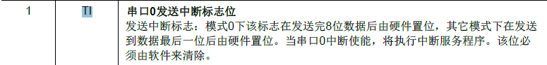 向SBUF的写入数据将会开启发送,此时移位时钟启动数据从RXD脚串行移出,直至8位数据传输完成。传输标志位TI (SCON.1) 置 1表示 1 个字节数据传输完成。