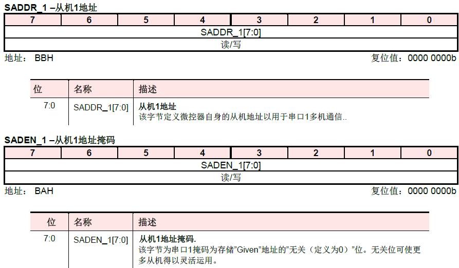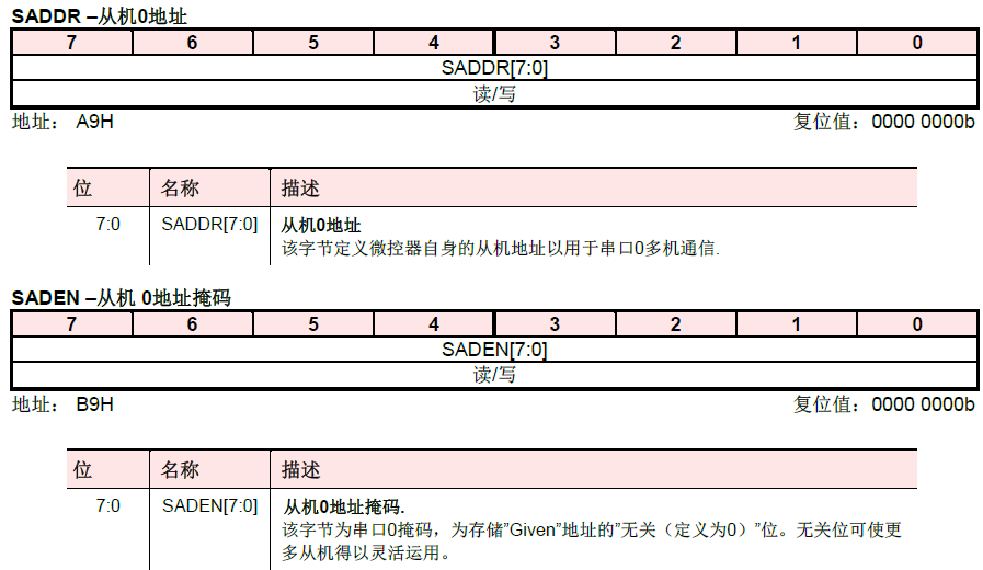 复位后,SADDR和SADEN初始化为00H。这将对于所有“无关”地址产生一个“Given”地址,以及一个“广播”地址对应所有XXXXXXXXb地址(所有“无关”位)。这样有效地禁止了自动寻址模式,允许微控制器保持标准串口模式而不使用这个功能。