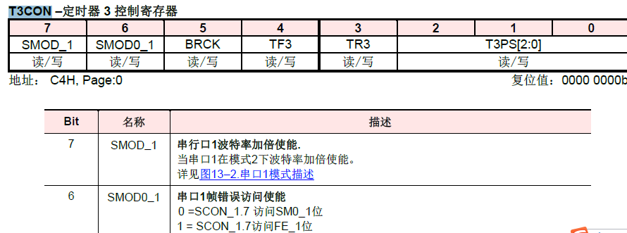 当采用定时器1作为波特率发生器,需要关闭定时器1中断。定时器1可配置为计数器或是定时器,三种工作模式都可以。典型应用中,会配置为定时器工作在自动重装载模式(定时器模式2)。如果采用定时器3作为波特率发生器,同样也需要关闭定时器3中断。