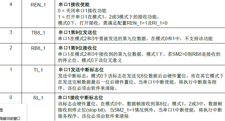 如果上述条件满足,SBUF将加载到接收数据,RB8(SCON.2)为停止位,和RI将被置1,如果条件不满足,RI保持为0,没有数据加载。完成接收过程后,串口控制器将等待RXD脚上出现另一个1-0传输以开始新的数据接收。