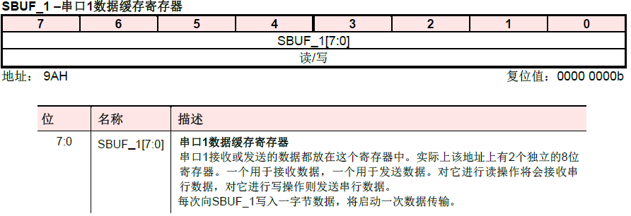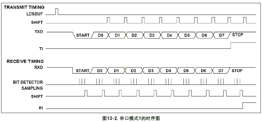 向SBUF写入数据开始传输,传输发生在TXD引脚上。首先是开始位,随后是8位数据位,最后是停止位。停止位出现后,TI(SCON.1)将置1 表示一个字节传输完成,所有位的传输速度取决于波特率。