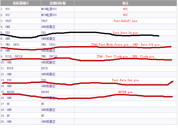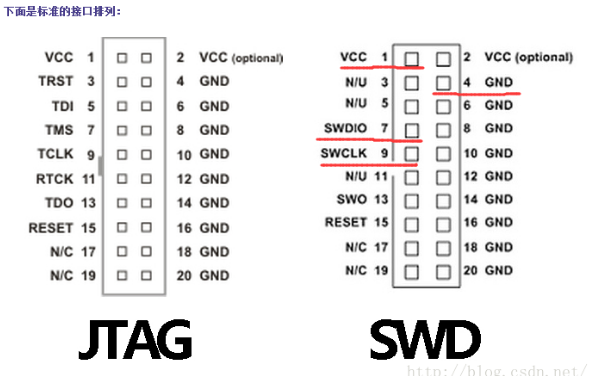 你可能知道JLINK的JTAG接口,先来一张图,看看它们之间的对应关系: