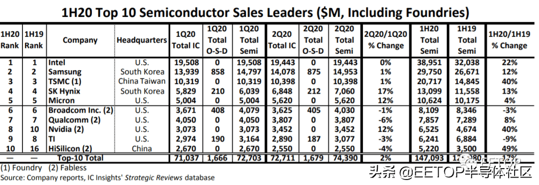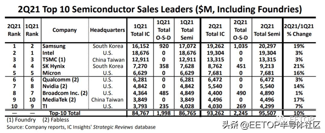 IC Insights刚刚发布了2021 年第二季度全球半导体供应商TOP10排名。