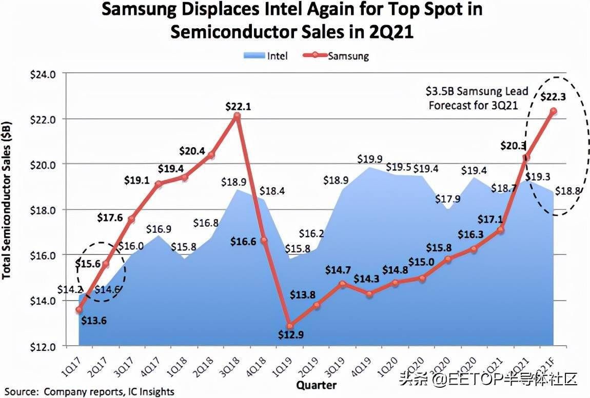 在 DRAM 和闪存需求激增和价格上涨的推动下,全球最大的内存供应商三星在 2021 年第二季度的半导体总销售额增长 19% 至 203 亿美元,超越英特尔,成为全球最大的半导体供应商。