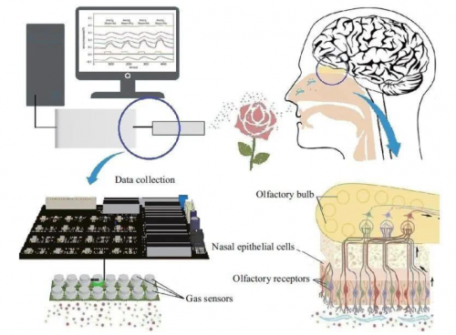 仿生电子鼻嗅觉识别芯片可以通过前端气敏材料的精准监测来对气味进行分析处理,转换成电子信号,构成传感器阵列对该气味的响应谱。