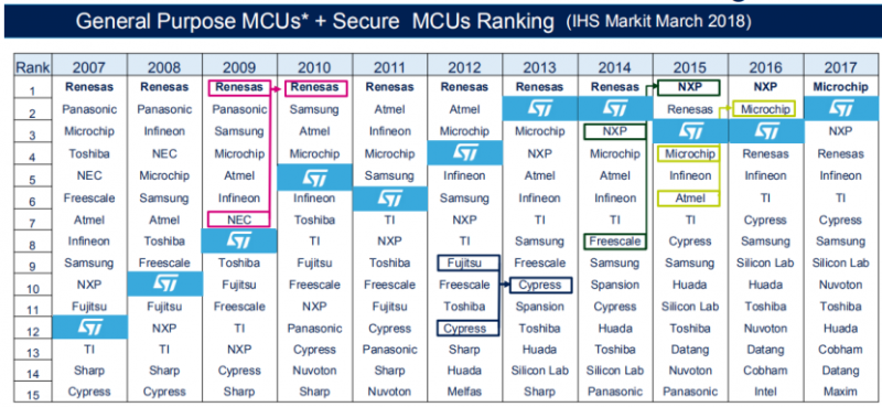 而根据IHS Markit在2018年3月发布的市场报告中显示,ST重返MCU市场第二,这其中既包含了STM32、STM8,同时也包含了安全类MCU。而从排名前几的公司来看,除了32位MCU之外,也都有8位或16位的产品线。也正因此,在32位市场排名第一的ST,如果想要继续前进的话,必须要8位MCU市场同时发力。