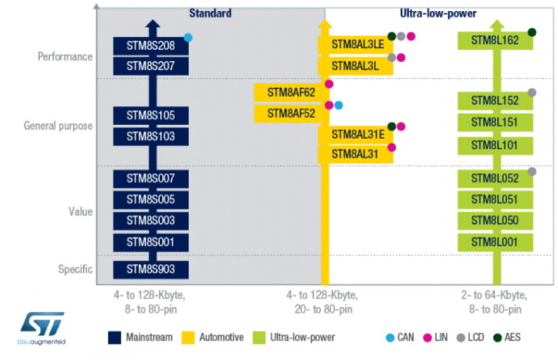 在产品线方面,STM8主要产品线分为三大类,包括主流系列STM8S,超低功耗系列STM8L以及车用级产品STM8A。