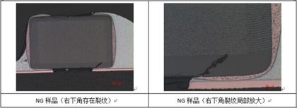 对切片进一步采用SEM/EDS分析,OK样品未发现明显异常,NG样品均存在明显裂纹,除此之外,未发现明显异常。