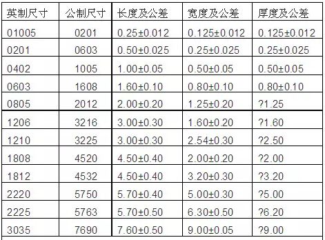 最小规格尺寸01005(长0.25mm*宽0.125mm),目前只有少数几家日本公司在批量生产;