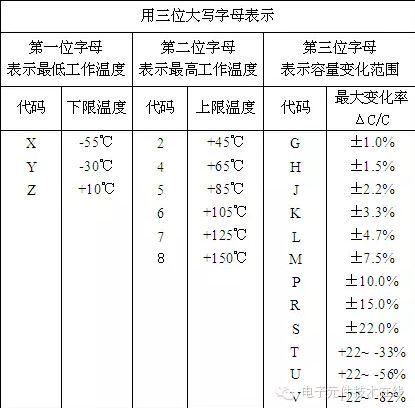 例:X7R表示-55℃~125℃温度区间内,以20℃为基准,容量允许变化范围±15%