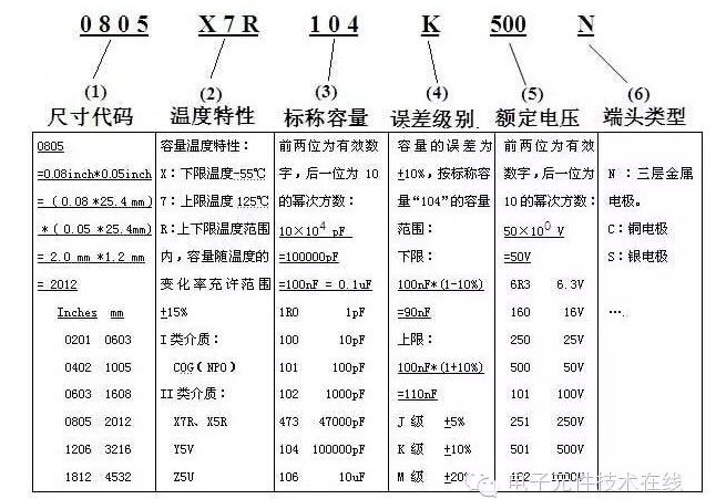 各制造商的产品规格命名规则形式上不尽相同,但规格代号中基本上都包括:尺寸、温度特性、标称容量、容量误差级别、额定电压和包装方式等信息。