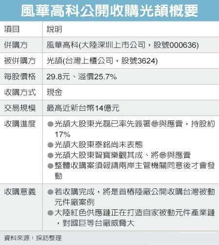 上柜被动元件芯片电阻厂光颉昨(22)日公告,已接获大陆深圳上市公司广东风华高新科技(风华高科)公开收购邀请,拟以每股29.8元、溢价25.7%收购最高40%股权,收购规模近14亿元。光颉持股约17%的大股东光磊已率先表态参与应卖。