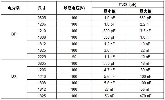 MIL-PRF-123系列MLCC的最高电压为100V,器件采用BP电介质,电容低至1.0pF,-55℃~+125℃ 温度范围内电容温度系数(TCC)为0ppm/°C±30ppm/°C,每十年的最大老化率为0%。BX器件的电容达470nF,-55℃~+125℃范围内TCC为±15%,每十年的最大老化率为1%。