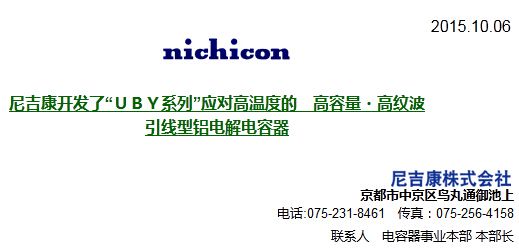 尼吉康开发了“UBY系列”耐高温度,高容量,高纹波引线型铝电解电容器