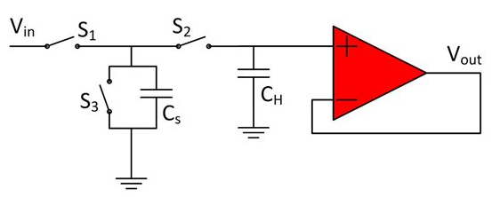 要对传感器上的电荷进行采样,通过闭合开关S1,并且打开开关S2和S3,使传感器电容器,CS,充满电。一旦CS被充满,S1和S3将打开,而S2将闭合。这就使得传感器电容器上累积的电荷被直接传输到保持电容器,CH中。一旦CH被充满,S1和S2将打开,而S3将闭合。这就强制地将传感器电容器的放电(为下一次采样做准备)与输出电压电势的缓冲(由CH保持稳定)隔离开来。