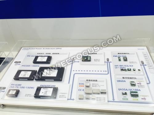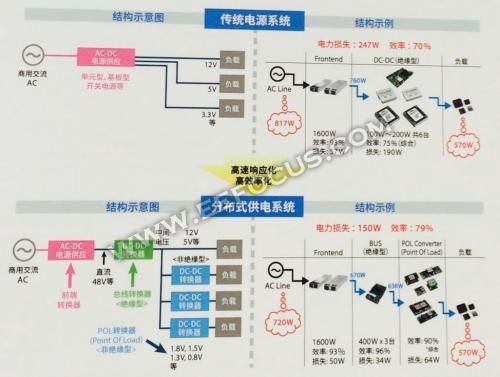 传统的电源系统是利用AC-DC变换器将220V交流电转换成12V直流电,然后直接为负载供电,TDK为了实现高速响应化和高效率化要求,采用分布式供电系统,利用AC-DC变换器将220V交流电转化成48V直流电,在应用于负载之前再利用总线变换器将电压转换成1.8V、1.5V、1.3V、0.8V不等的电压直接为负载供电。两种结构对比,新方案功率损耗从247W降低到150W,整体系统效率提高9%。