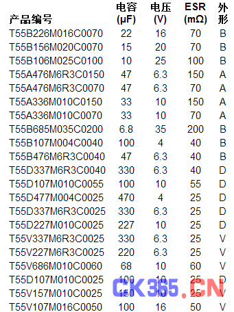T55系列的外形尺寸为J、P、A、B、T(低高度B,最高1.2mm)、D和V,电容范围为3.3μF~470μF,电压等级从2.5V到25V,电容公差为±20%。器件在+25℃和100kHz下具有500mΩ到15mΩ的超低ESR,工作温度范围为-55℃~+105℃。