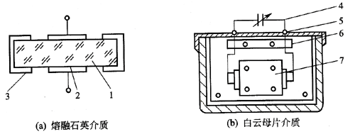 标准电容器所采用的电极形式及介质与其电容量值有关。10pF以下的小容量标准电容器常采用密封的空气、同轴圆柱形电极结构,其优点是稳定性好,但电容量不易做大。100~1000pF的标准电容器常采用空气、多层平板型电极结构。大于1000pF的标准电容器如仍采用平板型空气结构,则相当笨重,因而常采用云母镀银工艺制作。lO~l00pF的标准电容器常采用表面金属化的有机绝缘薄膜作介质,以减小体积。l00pF以上的标准电容器不易制作,常采用带有耦合变压器或运算放大器的等效大电容方式,等效电容量可高达IF以上。如图1所示分别为熔融石英介质和白云母片介质标准电容。