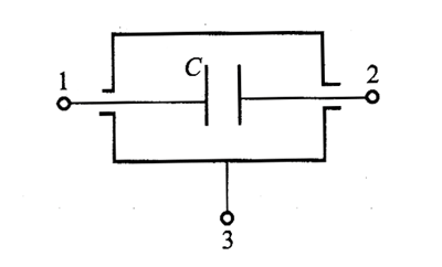 标准电容器为了消除杂散电容的影响,常用金属屏蔽罩将电容器屏蔽起来,并在屏蔽罩上设一接线端钮,称为屏蔽端钮,这样电容器就有三个端钮,如图2所示为三端钮标准电容器。图中1、2是标准电容器两个极板的引出端,3是屏蔽端钮。