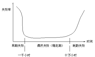 电子产品在生产制造时,因设计不合理、原材料或工艺措施方面的原因引起产品的质量问题有两类,第一类是产品的性能参数不达标,生产的产品不符合使用要求;第二类是潜在的缺陷,这类缺陷不能用一般的测试手段发现,而需要在使用过程中逐渐地被暴露,如硅片表面污染、组织不稳定、焊接空洞、芯片和管壳热阻匹配不良等等。一般这种缺陷需要在元器件工作于额定功率和正常工作温度下运行一千个小时左右才能全部被激活(暴露)。显然,对每只元器件测试一千个小时是不现实的,所以需要对其施加热应力和偏压,例如进行高温功率应力试验,来加速这类缺陷的提早暴露。也就是给电子产品施加热的、电的、机械的或多种综合的外部应力,模拟严酷工作环境,消除加工应力和残余溶剂等物质,使潜伏故障提前出现,尽快使产品通过失效浴盆特性初期阶段,进入高可*的稳定期。电子产品的失效曲线如图1所示。