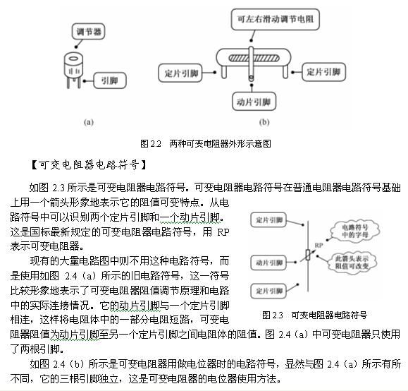 (2)可变电阻器共有三根引脚,这三根引脚有区别,一根为动片引脚,见图2.2所示的可变电阻器外形示意图,另两根是定片引脚,一般两个定片引脚之间可以互换使用,而定片与动片引脚之间不能互换使用。