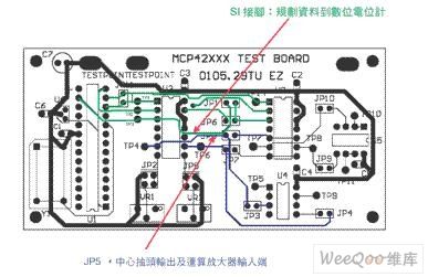 本电路可被用于两种基本操作模式;第一种模式用于可规划调整之直流参考电压,在这个模式中,只是偶尔使用电路之数字部份而在正常操作中却没有;第二种模式用于任意波型产生器,在这个模式中,电路之数字部份是操作核心,且可能发生电容耦合情形。图二中电路第一种完成布线如(图三)所示。