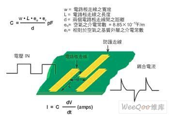 注:两条走线相邻布置,即可在一块电路板上形成电容。因为此种电容,在一条走在线快速电压变化可在另一条走在线引起电流信号。