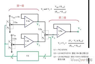 注:以三个8位数字电位计和三个运算放大器组成之输出电压达 6万5536阶之16位数字模拟转换器。如果 VDD 在这个系统内是 5V,这个数字模拟转换器分辨率或 LSB大小就是 76.3μV。