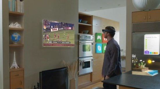 而Hololens是怎样的呢,它也会在屋子墙壁上投射出一个天气面板,但是不同之处在于,不管你怎样在屋子中走动,或者转动头部,天气面板始终都在那面墙上,它不会由于你的移动而移动(这主要里涉及空间感知定位技术,SLAM,即时定位与地图构建,为其中最主要的之一,作用是让设备实时地获取周围的环境信息,才能精确地将虚拟物体放在正确的位置,所以无论用户的位置无论怎么变动,虚拟物体的位置都可以固定在房间中的同一个位置)。