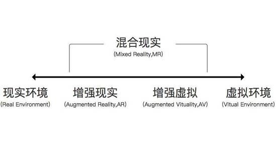 我把暂且把这张图叫做「现实-虚拟」区间(reality-virtuality continuum)。区间向左至无穷表示「现实环境」,依次向右为「增强现实(AR)」、「增强虚拟(AV,Augmented Vituality)」,直到向右至无穷表示「虚拟环境」,而「混合现实」则包含了「增强现实」与「增强虚拟」。