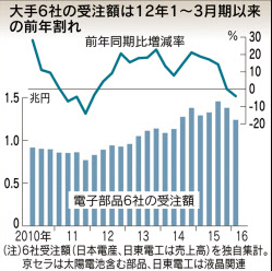 日本经济新闻独自统计了下京瓷、日本电产、日东电工、ALPS电气等6家公司的订单金额(包含部分销售金额),16年1-3月的订单总金额大约是1兆2400亿日元,从2012年1-3月期受到日本东部地震,泰国洪水的影响开始,直至2016年整4年里,单季度首次出现去年同期比下滑。2015年的整年度约5兆4000亿元,比2014年增长6%,这也是2012年开始的3年连续的2位数百分比增长的终结。