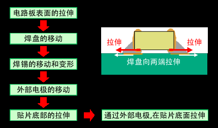 随着焊盘的移动,焊锡也会移动或产生变形。焊锡变形后,贴片的外部电极就会移动和变形,拉伸应力就会集中在贴片的外部电极的一端。