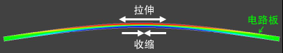 如图2所示,电路板上面被拉伸,下面被收缩。由于上面的拉伸,铜焊盘就会向左右移动。