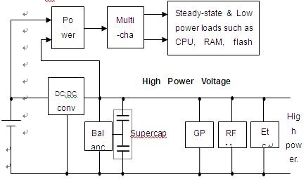 2.如果电源电压低于或高于高功率轨的电压,DC-DC变换器将作为升降压变换器。另外,有限流功能的电源管理IC如LTC3442a或TPS6300将控制超级电容的输入电流。上列TI升压调节器也可用于这个结构,因为它们在Vin > Vo时可用作低压差线性稳压器(LDO)。