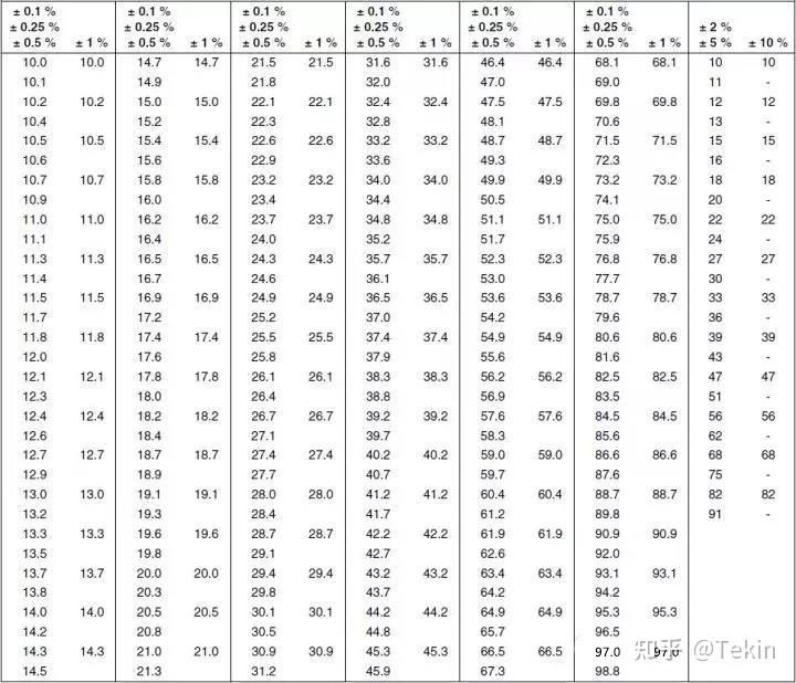 --E24系列适用于允差±5%(J)的电阻、电容和电感数值(注:现也用于1%的电阻)